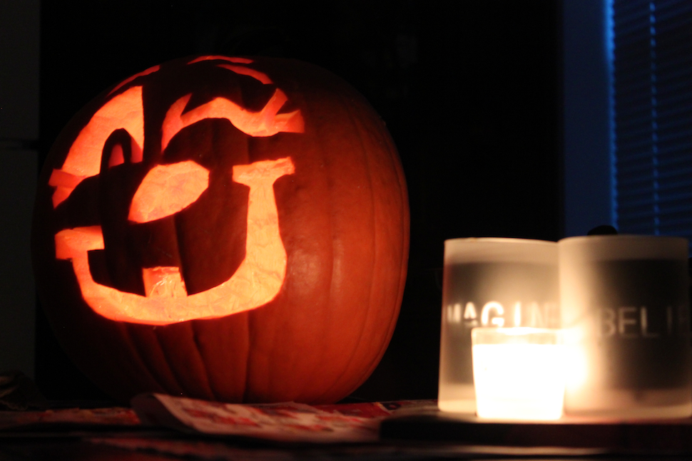 Tonight was a stormy one, with icy rain blowing sideways, so we stayed in and had our little annual pumpkin-carving party of two. This has become a time-honoured tradition lasting… well… since last Halloween… when I was visiting Maria and “meeting the parents” in California (yes, it was significantly warmer). On that momentous day under Angie’s direction we carved our pumpkin to life to the tune of traditional Christmas jingles, so this year we did some research and decided on a goofy pumpkin style we like to the tune of Michael Buble’s new holiday hits. And there the creature is.