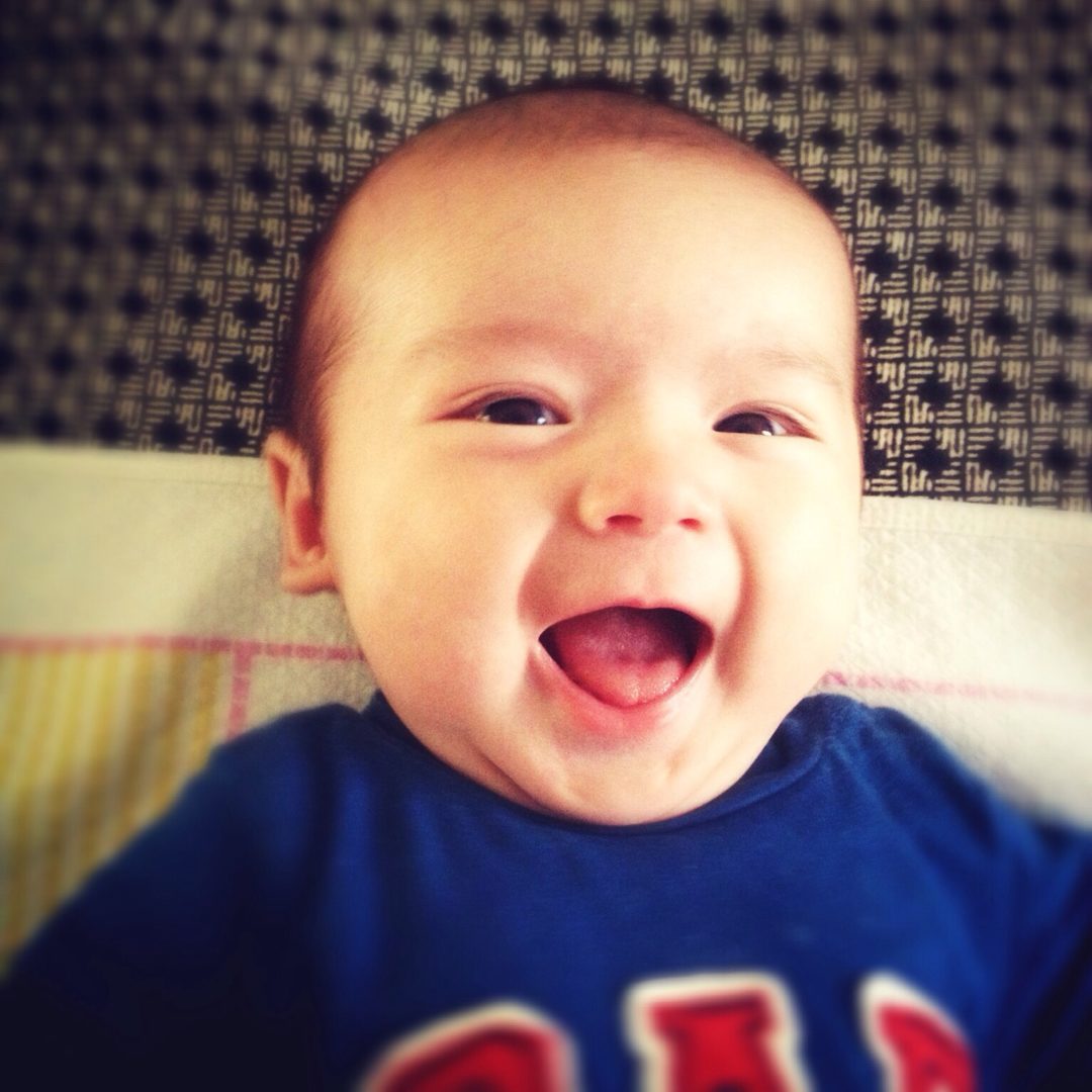 Dominic is four months old already! He is a bit cranky and needy today as he battles a low-grade fever after his second set of needles yesterday, but he still had a few smiles for us. He’s measuring in at 15 pounds 3 ounces, and 24.5 inches-about the length of my torso! He’s growing like a weed and becoming so much more self-aware everyday.